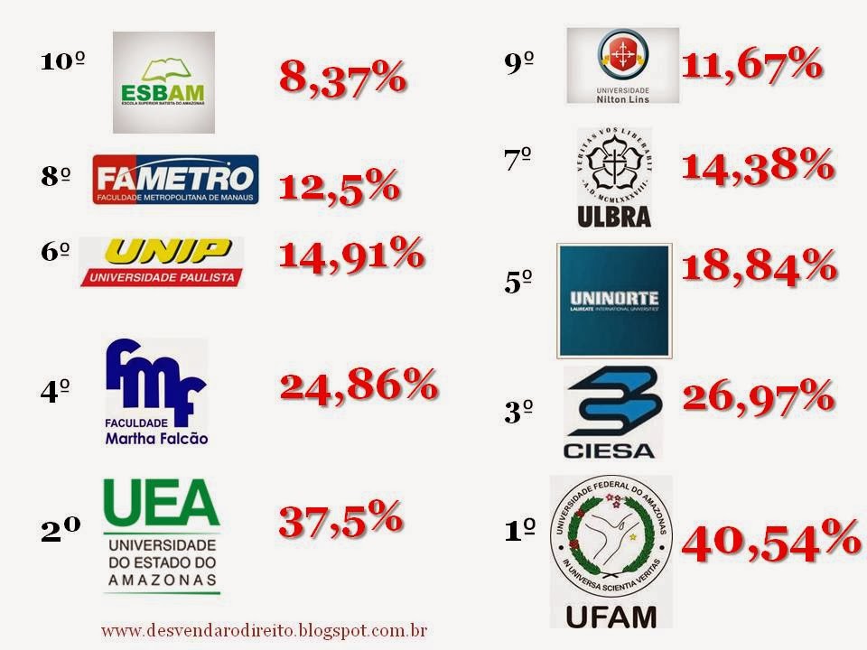 Obs: esse resultado é relativo ao X Exame Unificado de Ordem, divulgado na última semana de outubro de 2013 pela OAB. O último exame realizado pela OAB foi o XI, mas o desempenho das instituições nele ainda não foi divulgado.